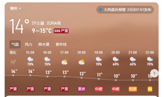 根據分析,受冷空氣大風影響,23日當天,湖北北部的襄陽、隨州、孝感、荊門、十堰東部、黃岡北部以及武漢北部將出現揚沙或浮塵天氣。受此影響,預計多個城市午后將陸續出現中度及以上污染。