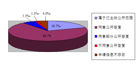 屬于已主動公開范圍的有15件,占19.7%;同意公開答復數53件,占69.7%;同意部分公開答復數4件,占5.3%;不同意公開答復數1件,占1.3%;申請信息不存在數3件,占4.0%。