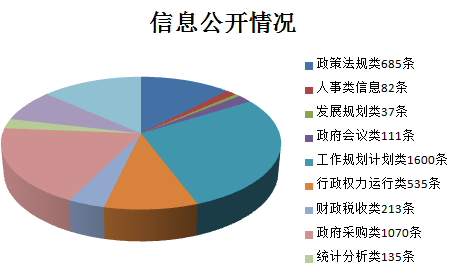 2017年,市政府及40個市直部門、17個鎮辦積極主動公開信息9047條。其中政策法規類685條,人事類信息82條,發展規劃類信息37條,政府會議111條,工作規劃計劃類1600條,行政權力運行類535條,財政稅收信息類213條,政府采購類信息1070條,統計分析類信息135條,公共服務類信息449條,政府重點工作類信息763條。