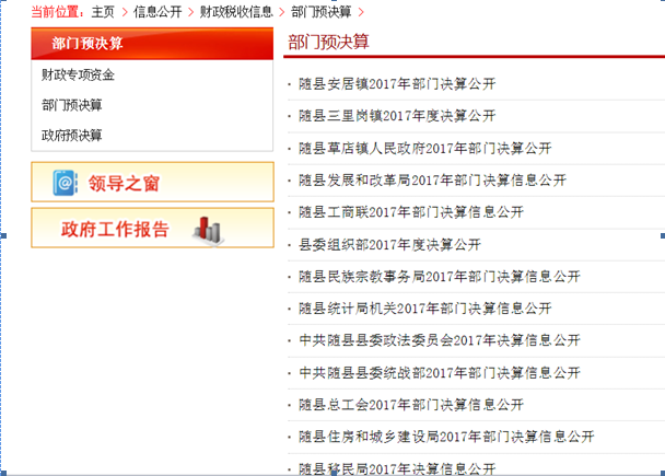 ????(一)財政預決算信息公開。隨縣人民政府網站“財政資金”專欄已公開2018年縣級政府預算和部門預算、2017年縣級政府決算和部門決算。除涉密部門外,縣直部門均已公開2018年部門預算及2017年部門決算,實現縣級預算單位預決算公開全覆蓋。嚴格按照上級要求,進一步細化預算公開內容,建立健全預決算公開統計和督查工作機制,定期公開預算執行情況等相關信息,做到公開內容全面、真實、完整,形式規范。2018年全縣共發布財政預稅收信息210余條。