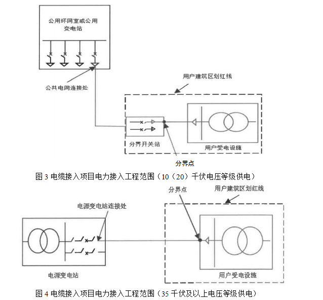 2.電纜接入項(xiàng)目電力工程范圍為建筑區(qū)劃紅線內(nèi)分界開(kāi)關(guān)站至公共電網(wǎng)連接處(35千伏以及上電壓等級(jí)供電項(xiàng)目為用戶側(cè)進(jìn)線總開(kāi)關(guān)至電源變電站連接處)的所有電力工程,以用戶電源線路接入分界開(kāi)關(guān)站的連接點(diǎn)(35千伏以及上電壓等級(jí)供電項(xiàng)目為用戶側(cè)進(jìn)線總開(kāi)關(guān)上樁頭)為分界點(diǎn),分界點(diǎn)電源側(cè)供電設(shè)施屬于電力接入工程范圍,負(fù)荷側(cè)受電設(shè)施由用戶投資建設(shè)(僅為參考,具體位置各單位自行確定)。