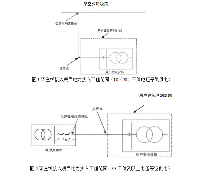 1.架空線接入項(xiàng)目電力接入工程范圍為用戶建筑區(qū)劃紅線外第一斷路器或第一支持物至公共電網(wǎng)(35千伏以及上電壓等級(jí)供電項(xiàng)目為電源變電站)連接處的所有電力工程,以用戶電源線路接入用戶建筑區(qū)劃紅線處第一斷路器或第一支持物的連接點(diǎn)為分界點(diǎn),分界點(diǎn)電源側(cè)供電設(shè)施屬于電力接入工程范圍,負(fù)荷側(cè)受電設(shè)施由用戶投資建設(shè)。