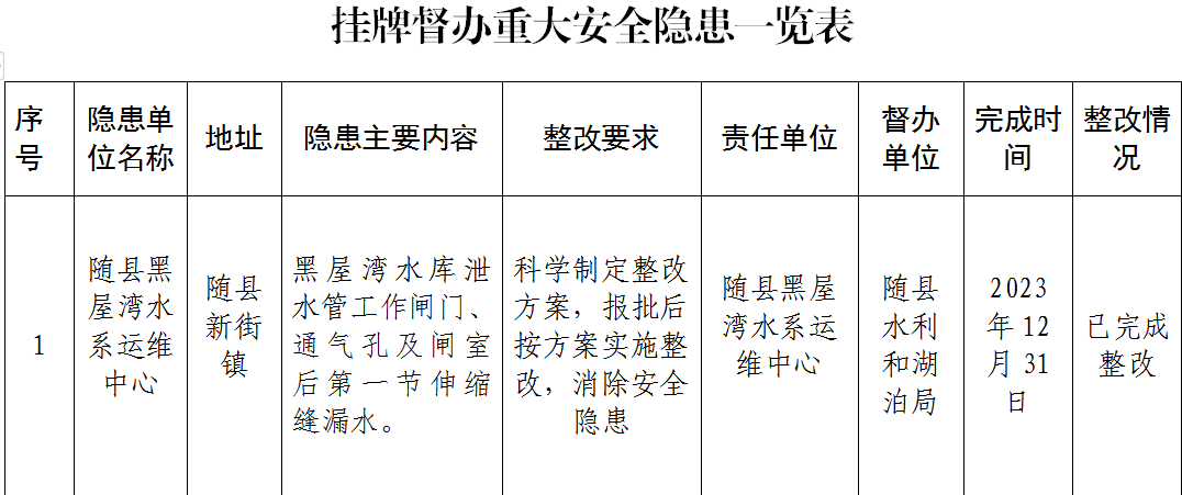根據《關于對黑屋灣水庫泄水管重大安全隱患進行掛牌督辦的通知》,市水利和湖泊局對黑屋灣水庫泄水管重大安全隱患進行了掛牌督辦。經過整改責任單位按要求整治,隨縣水利和湖泊局經檢查驗收后向市水利和湖泊局報送了銷號申請。
