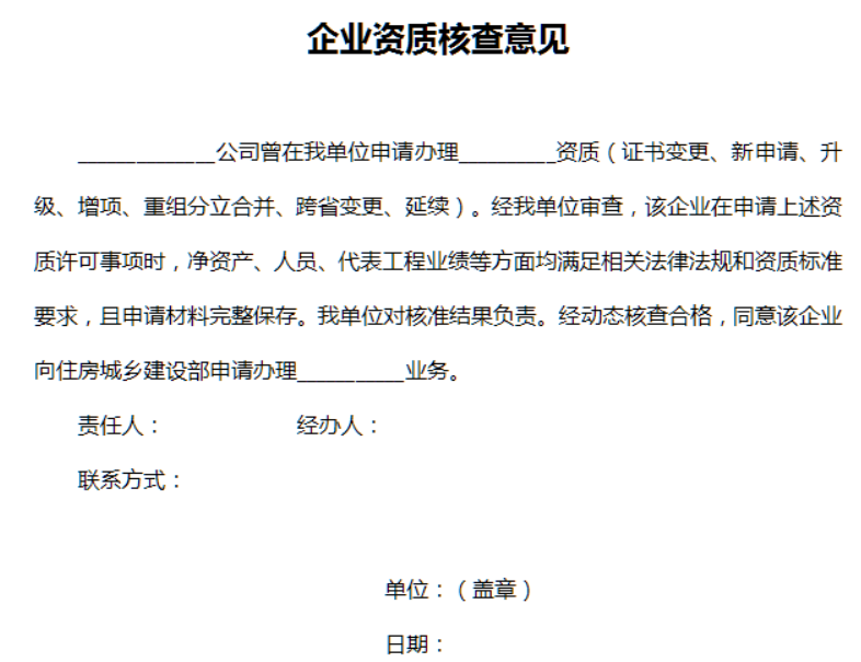 答:企業(yè)申請資質(zhì)升級(含新申請),增項,延續(xù)以及發(fā)生重組分立、合并、跨省變更、國企改制(含事業(yè)單位改制)資質(zhì)重新核定的,由住建部辦理。申請上述事項前,企業(yè)需向省廳提交企業(yè)資質(zhì)核查意見申請(申請模版文件見省住建廳《關(guān)于建設(shè)工程企業(yè)資質(zhì)延續(xù)有關(guān)事項的通知》(廳頭〔2023〕2441號)附件1,同時附營業(yè)執(zhí)照及現(xiàn)有資質(zhì)證書掃描件),由省廳審核后出具企業(yè)資質(zhì)核查意見(具體格式附后)。